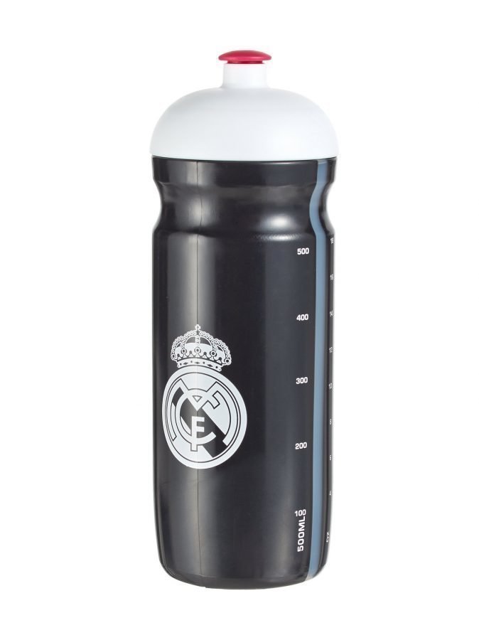 Juomapullossa on Real Madrid -joukkueen logo. Muovisen pullon tilavuus on 0,5 litraa ja pullon mitta-asteikosta näkee nopeasti, kuinka paljon vettä pullossa on vielä jäljellä.