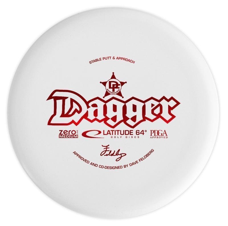 Latitude 64° Medium Dagger frisbeegolfkiekko. Dagger on hidas putteri, joka sopii kaikentasoisille pelaajille. Latitude 64°:. Opto:. *Läpikuultava ja erittäin kestävä muoviseos. *Säilyttää lento-ominaisuudet pitkään. Zero:. *Puttereissa käytetty hieman pehmeämpi muoviseos. *Takaa erittäin hyvän pidon mutta toisaalta kuluu hieman nopeammin. LENTOLUVUT:. Nopeus: Nopeus voi olla välillä 1-14. Nopeus kertoo kuinka pitkiin heittoihin kiekko on suunniteltu. Liito: Liidon mitta-asteikko on 0-7. Kiekko jolla on enemmän liitoa pystyy paremmin pysyttelemään ilmavirran mukana. Vakaus: Vakaus mitataan välillä -5 ja 1. Mitä pienempi vakaus sen enemmän kiekko kaartaa oikealle oikeakätisen pelaajan perusheittotyylillä. Feidi: Loppufeidi vaihtelee välillä 0-5. Korkean loppufeidin kiekko kaartaa enemmän vasemmalle lentoradan loppupäässä, kun sitä heittää oikeakätinen pelaaja perusheittotyylillä.