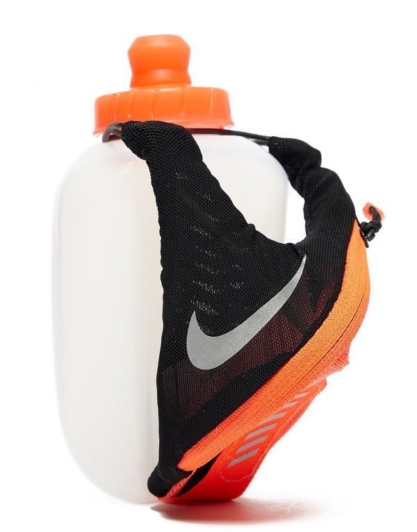 Get simple access to water and stay hydrated with this 10oz Handheld Water Bottle from Nike. The ergonomic canteen is lightweight and comfortable to hold especially with the integrated hand strap made of breathable mesh. It also features an expandable zip pocket that can stretch to provide more storage space. A hook-and-loop closure ensures that everything is secure. Finished with a silver reflective Swoosh tick.
