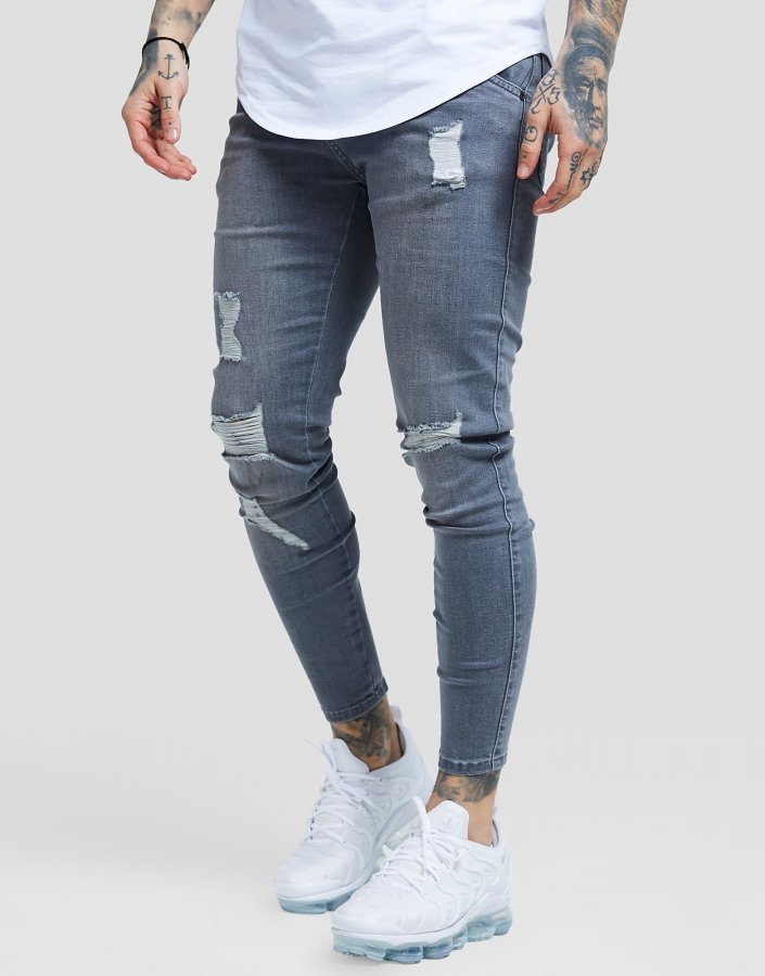 Keep your classic look with a modern edge in these men’s Ripped Jeans from SikSilk. Coming in a casual grey colourway, the denim jeans are made from a stretchy cotton material for a skinny cut which is both stylish and comfortable. With a classic button and zip fastening to the waist, the jeans are finished with ripped detailing throughout. Stephen James is 6’2″ and wears a size medium.