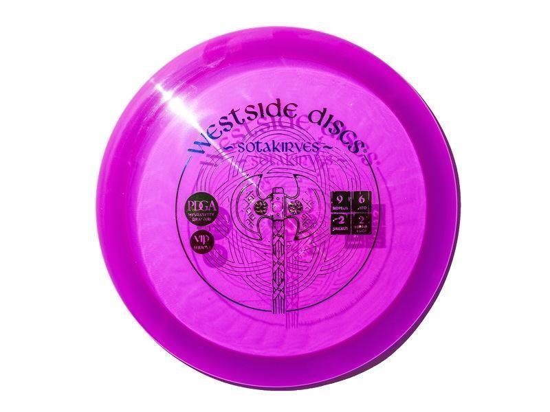 Westside VIP Sotakirves frisbeegolfkiekko. Alivakaa kontrollidraiveri joka tottelee hyvin vähemmän pelannutta heittäjää. Westside. BT-Muovi:. *Jämäkkä muoviseos. *Alivakaampana usein helpompi heittää jos kyseessä uusi harrastaja. *Erittäin hyvä pito mutta toisaalta kuluu hieman nopeammin. BT-Soft -Muovi. *Puttereissa käytetty hieman pehmeämpi muoviseos. *Takaa erittäin hyvän pidon mutta toisaalta kuluu hieman nopeammin. VIP-Muovi:. *Läpinäkyvä ja superkestävä hi-tech muovi. *Säilyttää lento-ominaisuudet pitkään kulumisesta huolimatta. *Sopii kaikentasoisille pelaajille. VIP AIR -Muovi. *Mikrokupia VIP -muovin sisällä jonka ansiosta kiekkojen painoista saadaan kevyempiä. *Kestää kuitenkin kolhuja ja säilyttää lento-ominaisuudet hyvin. Tournament -Muovi. *Erikoisseos VIP -muovia ja teknistä polymeeriä. *VIP -muovia parempi grippi sateella. *Superkestävä. LENTOLUVUT:. Nopeus: Nopeus voi olla välillä 1-14. Nopeus kertoo kuinka pitkiin heittoihin kiekko on suunniteltu. Liito: Liidon mitta-asteikko on 0-7. Kiekko jolla on enemmän liitoa pystyy paremmin pysyttelemään ilmavirran mukana. Vakaus: Vakaus mitataan välillä -5 ja 1. Mitä pienempi vakaus sen enemmän kiekko kaartaa oikealle oikeakätisen pelaajan perusheittotyylillä. Feidi: Loppufeidi vaihtelee välillä 0-5. Korkean loppufeidin kiekko kaartaa enemmän vasemmalle lentoradan loppupäässä, kun sitä heittää oikeakätinen pelaaja perusheittotyylillä.